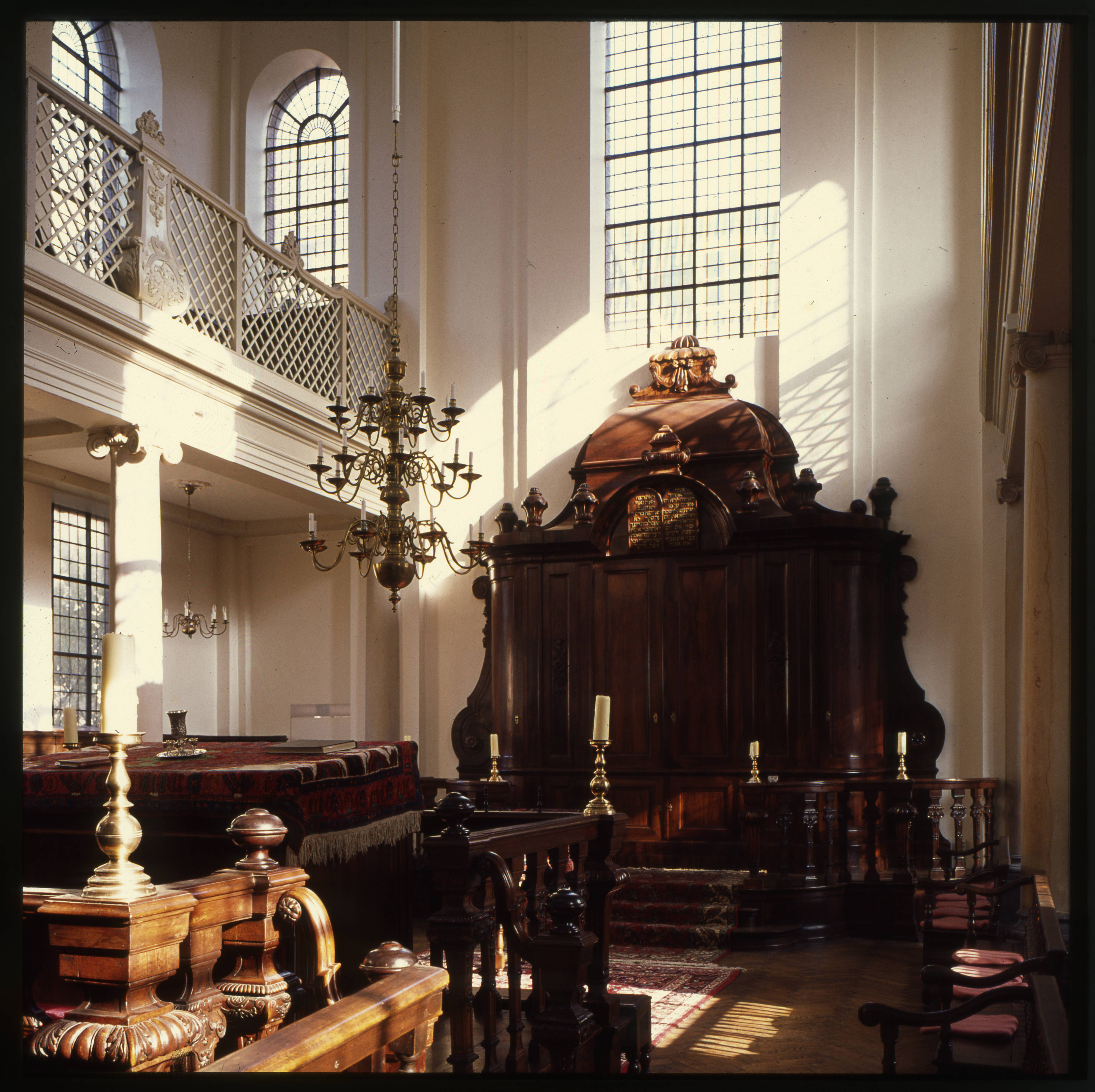 - Het interieur van de synagoge van de Liberaal Joodse Gemeente, Prinsessegracht 25, 1980. Foto: Gemeente Den Haag